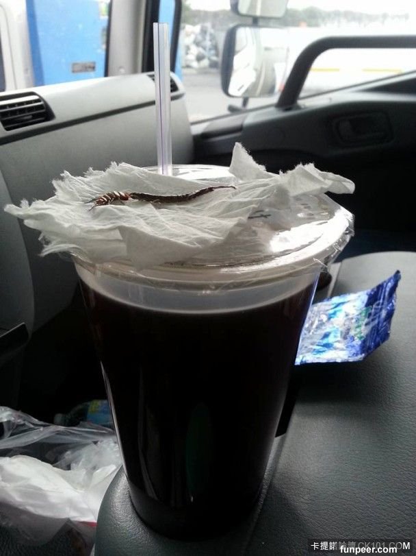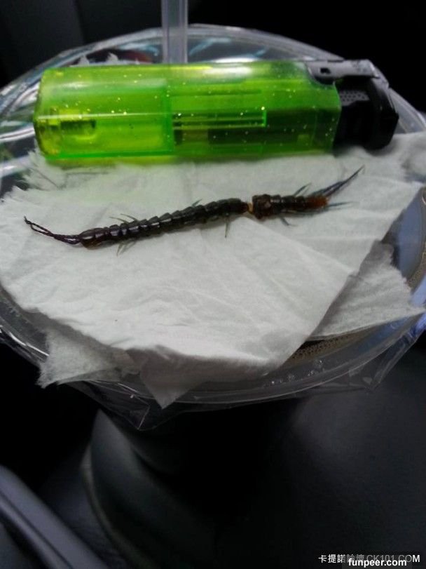 一名姓楊的網民表示,買紅茶後只吸了一口,感覺有「渣」,原以為是茶葉,結果吐出來一看,才發現是一個打火機般長的蜈蚣。楊某不禁失聲高叫「哇…好大一隻高蛋白啊」。