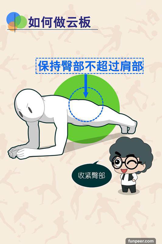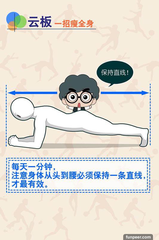 什麼是平板支撐(plank)?平板支撐的動作其實只有一個,不用教練就能完全掌握——你只要伸直全身進入俯臥姿勢,用腳趾和前臂支撐住身體,保持儘量長的時間就可以了。這是最流行的無器械運動,可以有效地鍛鍊腹橫肌,屬於消耗式塑身,體驗下來,一分鐘後全身顫抖,此時最消耗,能堅持就堅持,每日比前一天多5-10秒,一個月後就能重現「人魚線」。