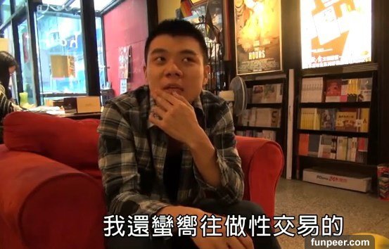 他大學念清大資工,但不想畢業之後和大家一樣去寫程式,如果跟大家一樣,自己的感覺就不見了,他怕被忽略,希望被看到。自拍打手槍的影片,動機也是因為如果有人看過了,就會主動過來跟我講話。他說自己其實很少社交,之前還有在上班的時候,通常就是上班,下班去咖啡館坐坐,然後回家。周末如果一個人白白度過,會不甘心,但也不大會想要找人,大概怕被拒絕吧。