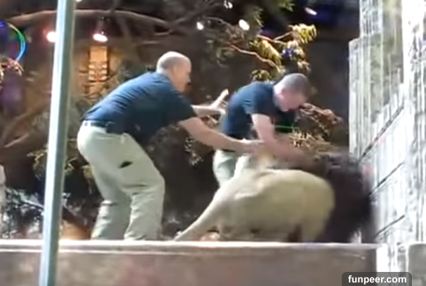 動物園裡的獅子飼養員平時與這群兇猛的獅子為伍,培養出了「超友誼」的好情誼,但不免還是會遇到獸性大發的時候。影片中這頭公獅平常非常溫馴,但不知怎麼了卻瞬間翻臉,朝著其中一位飼養員猛撲,儘管一旁的飼養員上前制止,卻還是無法阻止發狂的獅子緊追著飼養員不放。