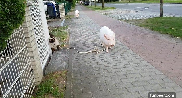 圖片轉自每日郵報下同在德國有一隻名字叫Leonardo的暹羅貓他每天最大的樂趣就是帶主人家裡的兩隻豬小弟出來逛大街!可是往往牠都會比兩隻豬小弟還要先疲累變成豬走在前頭,他在後面偷懶XD讓路過的人都以為是兩隻豬在溜貓!?