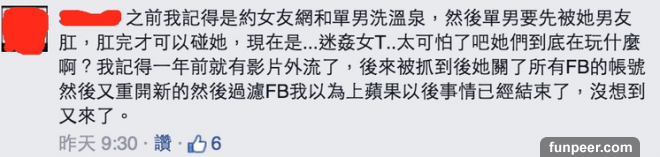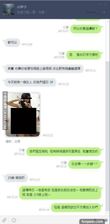 「只要男人們先被老公X,他們才可以碰我!」新北市27歲邱姓女子自稱「妮妮」,常在臉書PO養眼裸照,號召網友同她與前夫泡「裸湯」、作風大膽,行為很惡劣,老是在網路上拐涉世未深的女生參加她的性愛趴,然後拍下裸照在散佈在網路上,上次已經被網友電爆過上了新聞,現在他們轉戰LINE群組,變本加厲,網友爆料開始把魔掌伸向女同圈裡面,迷姦女T和味成年少女!
