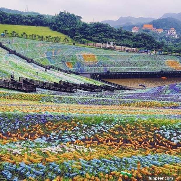 位於基隆的梵谷星空草原,最有名的就是用回收的400萬支寶特瓶做成的裝置藝術,費時半年用夢想的顏色塗裝成夢幻的星空草原,要是沒親眼看到還以為是一片璀璨花海呢!