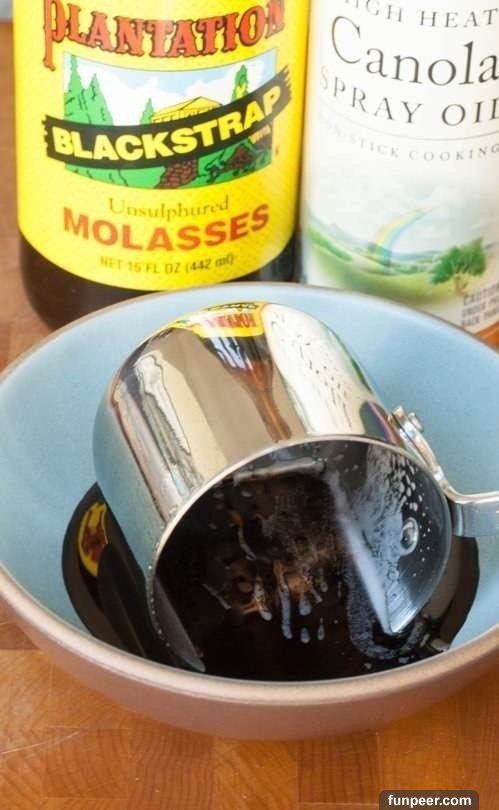 在製作一些有黏性的混合食物時,先在容器內噴一層食用油,這樣更容易倒出來,也更好清潔。