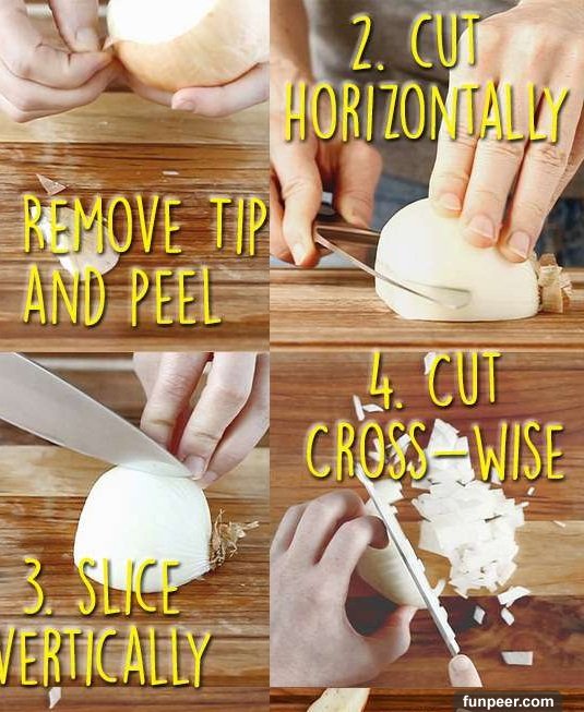 先把洋蔥在冰箱放30分鐘,然後將外皮剝去,從上面開始切,不要破壞根部,你就不會流眼淚了。