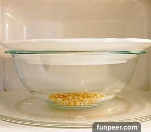 將玉米粒放進碗中,放入一些橄欖油和調味料,蓋上微波爐用盤子,微波加熱約2分鐘45秒,就能做出的爆米花。