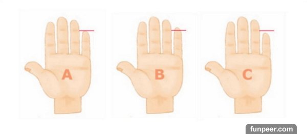 測驗的方法很簡單,只要觀察小拇指的指尖落在旁邊無名指的何處,就能輕鬆歸納出A、B、C三種結果囉~