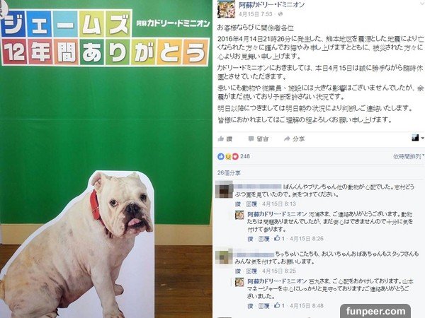 ▲詹姆斯寫真展因為強震喊卡,動物園宣佈關閉。阿蘇卡德利動物樂園因為「小龐之家」受到許多人參觀熱愛,遊客能夠近距離接觸紅極一時,不過2012年因為小龐發生咬傷女實習生的意外加上火山活動頻繁,從此來客數大減。沒想到遇上熊本強震臨時關閉。![]()