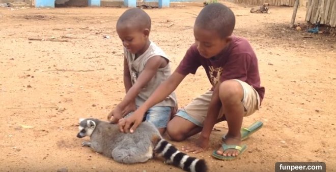 動物與人類的交流有很多形式,有時候只要透過溫柔的撫摸,牠們就能查覺到人的善意;以下這兩個小男孩就帶着好奇在觸摸一隻趴在地上的狐猴,狐猴除了放鬆讓他們接近外,還做出了超可愛的舉動呢! ▼這兩個小男孩輕輕摸著這隻趴着的狐猴,而狐猴也似乎很享受這樣的碰觸。