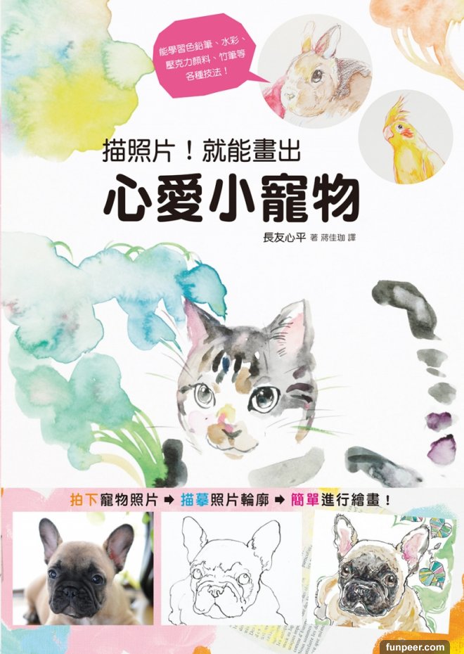 溫馨又有點前衛的似顏繪,這樣的畫風很少見。用描摹照片的方式畫畫,簡單又輕鬆,再以各種顏料上色,壓克力顏料給人繽紛活潑的印象、或是柔和溫暖的水彩及色鉛筆,最後還有竹筆的獨特筆觸,將寶貝的寵物畫得生動又可愛!將對寵物滿滿的愛意,呈現在作品上!貓咪、狗狗、兔子、鳥寶,總是無法畫出自己期望的樣子嗎?推薦給夢想畫出心愛寵物的主人們,獻給心愛的家人吧!