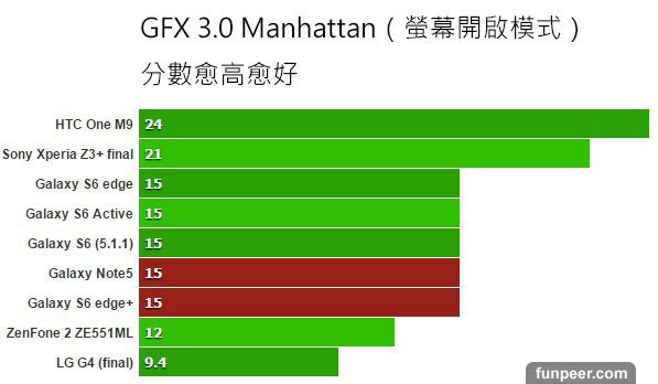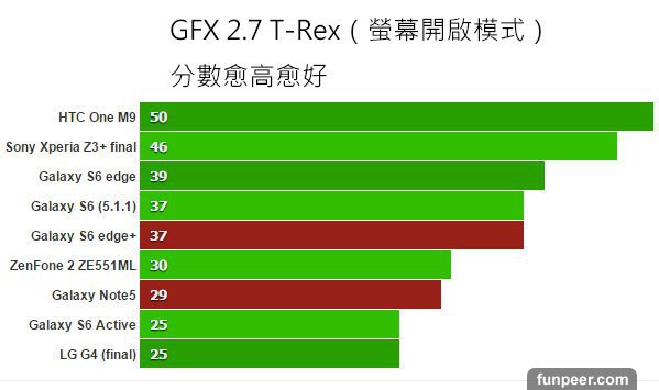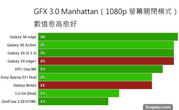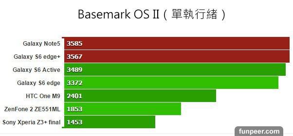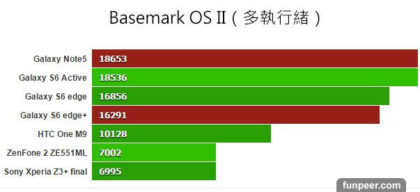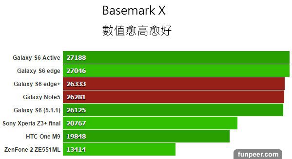 Basemark X 用來測試遊戲跑分,不用超頻的方式進行。數值愈高愈好,Note 5 與 S6 edge+ 表現幾乎與 S6、S6 edge 一樣。