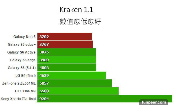 Kraken 1.1 測試瀏覽器的JavaScript 執行效能,分數愈低愈好。這裡使用三星的瀏覽器進行測試。
