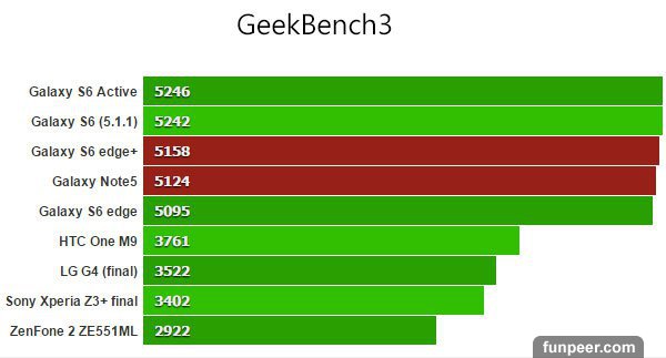 首先是測試 CPU 效能的 Geekbench 3 項目,結果並沒什麼讓人驚喜;Note5 與 S6 edge+ 與其它兩台 S6 家族相當。
