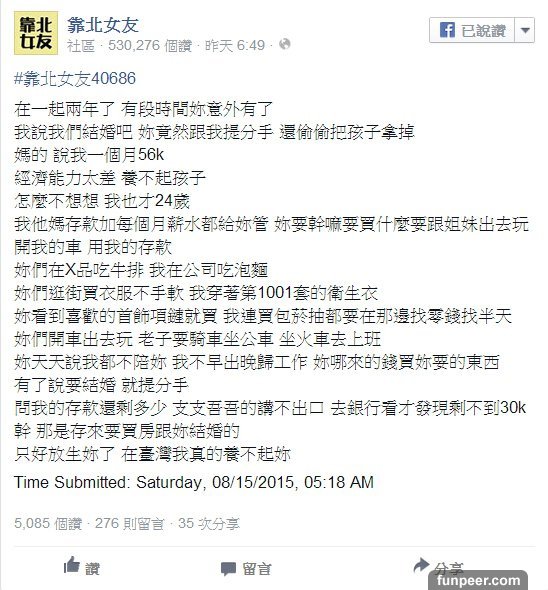 56K被女友嫌窮墮胎 24歲男放生:在台灣,我真的養不起妳!