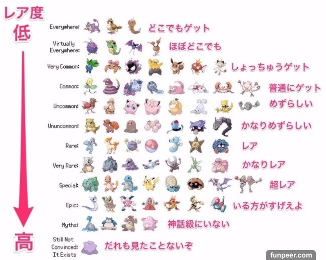 日本網友かいる∅kairu自己分析分享出了一張寶可夢列表,上面列出什麼是各個稀有度高低的神奇寶貝。(上面是最普通,越下面越稀有特別喔!)