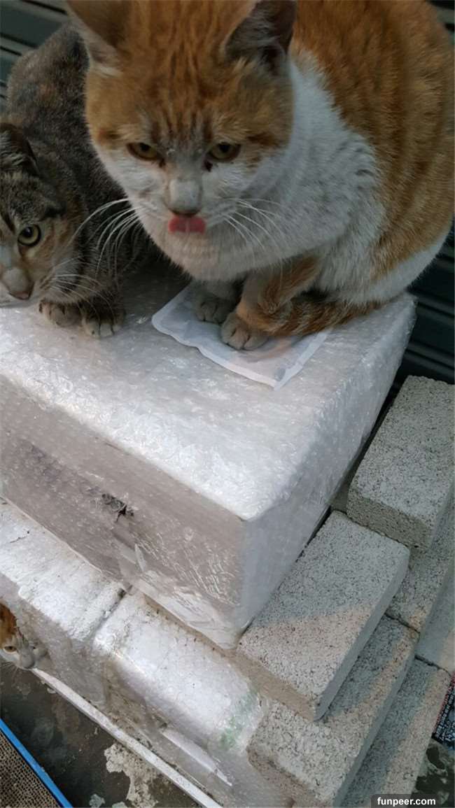 橘貓一臉幸福的滿足表情也吸引了其他同伴想要取暖!灰貓:"ㄟ~~換我了啦!"橘貓:"門都沒有,這是人家賞給我的!"