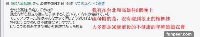 網路上日文關鍵字熱搜「ビンロウ 台灣 」會搜出早些年前日本鄉民拍下檳郎西施的照片: