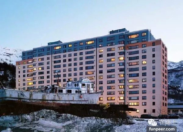 美國的阿拉斯加有個叫Whittier的小鎮,幾乎整個鎮子的居民都住在這樣一棟樓裡。