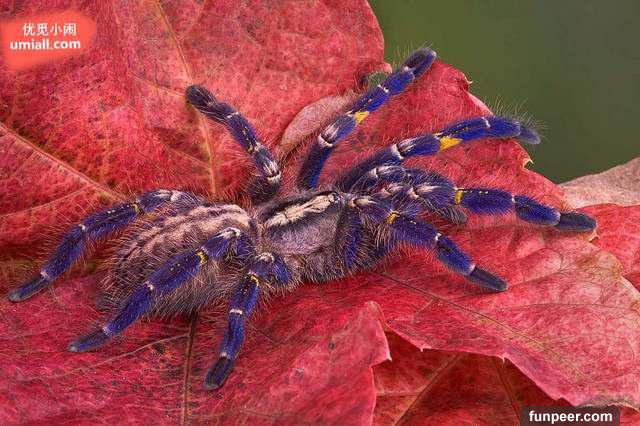 這種遍體呈藍色的蜘蛛起初只生活在印度南部。由於非常珍貴,部分飼養者願意以高達500 美金收購。因為顏色鮮豔,很多人喜歡將他們當作寵物,所以被大量捕捉...它們的野生數目正不斷下降,因此瀕臨絕種。