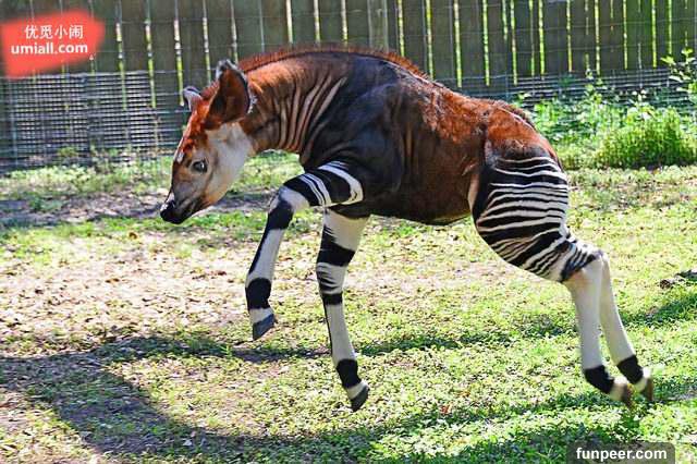 這種酷似長頸鹿和斑馬的混種生物是長頸鹿現時尚未滅絕的唯一近親,臀部和腿的上部則有水平的黑白條紋,但與斑馬卻無血緣關係。直到1901年,人們才在非洲薩伊森林發現他們的身影,由於生活環境遭到破壞以及被不斷捕殺,現在大約只剩下20000只。