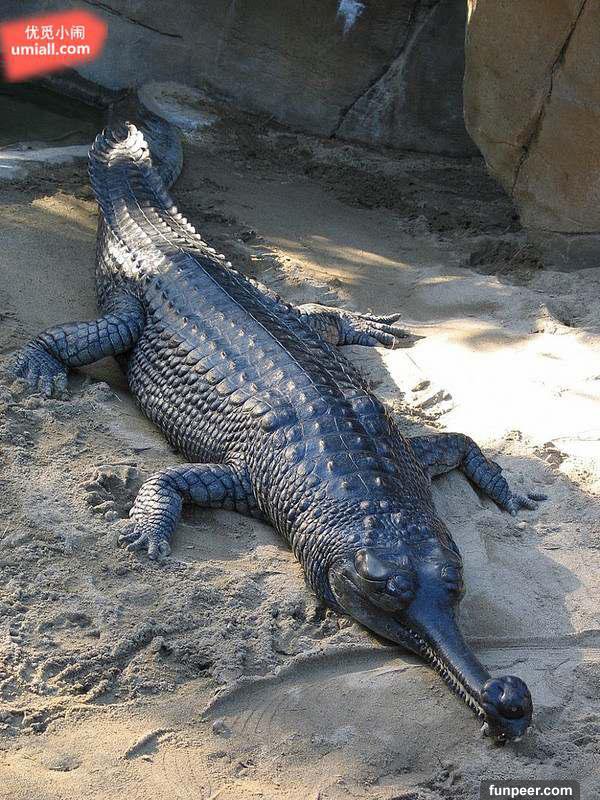 又稱“長吻鱷”,是一種淡水鱷魚,能夠生長至約20尺,重約350磅。主要分佈響印度河、恒河、馬哈拉迪河及布拉瑪普特拉河這4條河當中。因為獨特的嘴部結構,他們只能以魚類為食。由於過度捕殺,現在全世界只剩下少於235只,主要棲息於印度和尼泊爾。