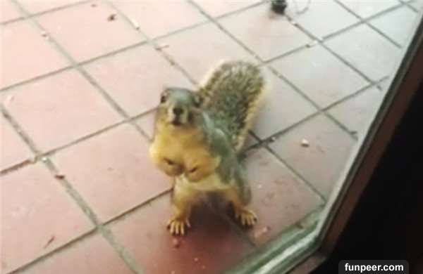 這隻小松鼠某天無意間溜到這戶人家的後院,主人看到牠可愛的樣子就給了牠一顆花生。沒想到牠從此記住了這戶人家有美食,常常來這裡討花生吃。讓人覺得有趣的是,每次牠來都很有禮貌,所以讓這家人也樂於準備花生等牠。