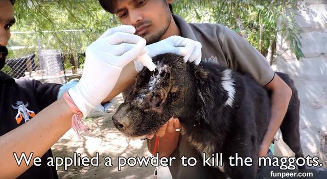 (圖片翻攝自youtube) 志工把藥粉灑在他臉上驅蟲