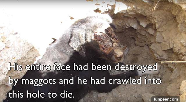 (圖片翻攝自youtube) 救援組織發現他時,他幾乎失去了整張臉…他準備在這個洞裡等死…