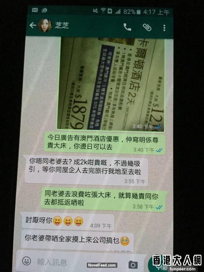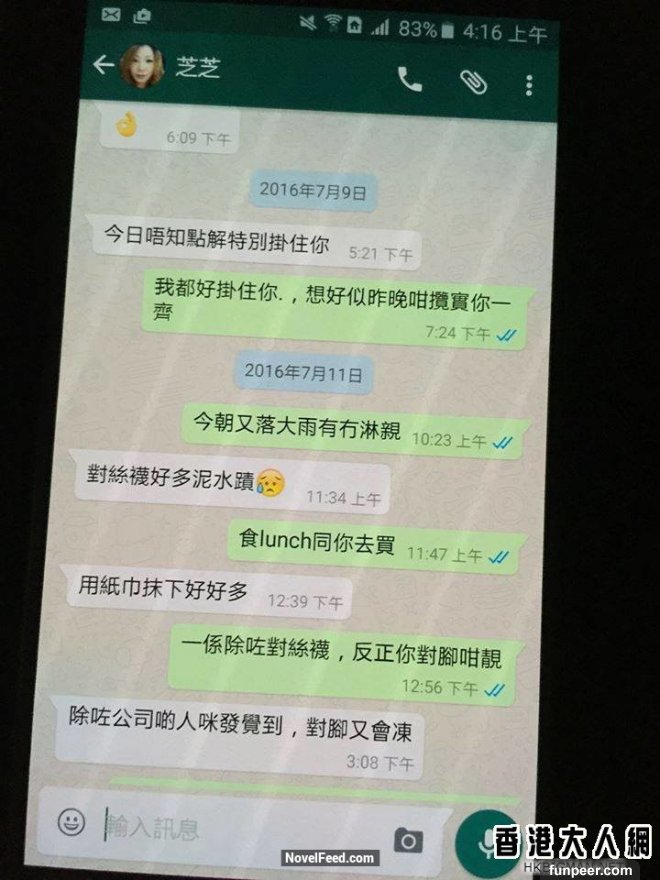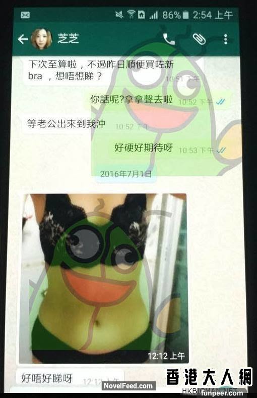 佢仲補充幾年前同芝芝去過船P, 肯定佢身上係無紋身. 條片見嘅紋身一係最近紋, 一係暫時性紋身, 去泰國旅行都好多人會印紋身過下癮.網上又瘋傳一輯情慾 whatsapp, 今次男女主角係同事關係, 而且彼此都結咗婚, 有埋小朋友.男主角老婆係《香港討論區》貼文話7月9日, 老公帶兩個仔女落去會所游水, 但佢無拎手機… 突然有message 彈出話「好掛著佢」, 佢老婆成個人感覺眼前一黑… 本來佢老婆都信佢, 想尊重老公隱私, 但諗咗成晚, 最後都忍唔到, 半夜起身check 佢手機.結果係比佢老婆想像中更恐怖, 佢話:「事實真相好殘,我突然覺得老公好陌生好dirty,佢背後竟然背叛我!我有理由相信佢地已經上過床,去過好多次街!」