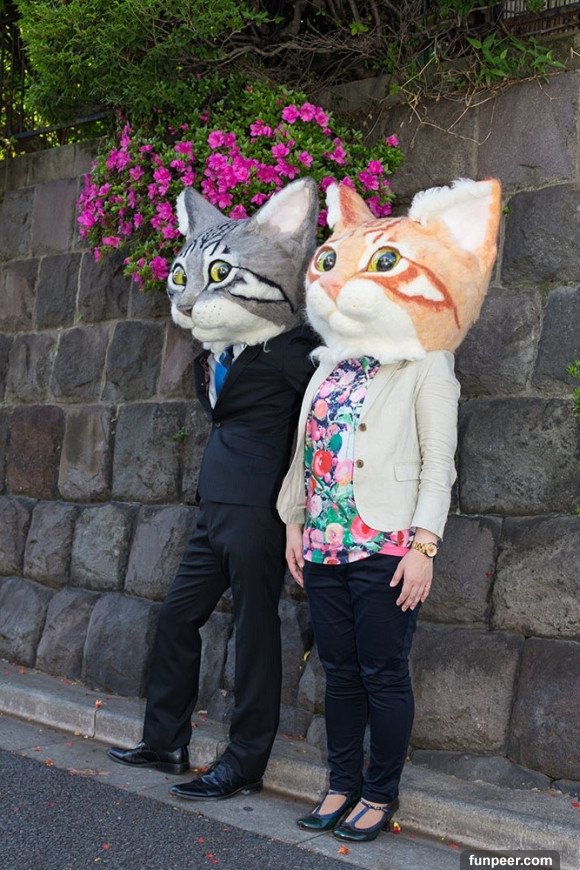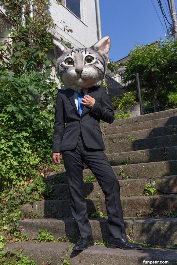而這個羊毛氈貓咪頭套不管穿什麼衣服,意外的都很適合欸~變身成為帥氣西裝貓大叔~