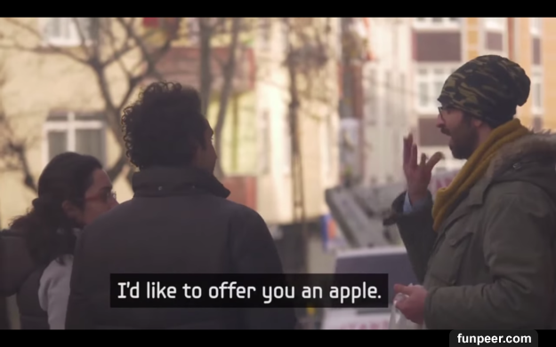 ↓↓他幫別人撿了地上的橘子之後,對方回贈蘋果表示感謝,用的也是手語
