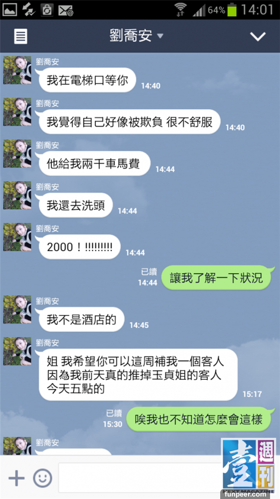 ▼劉喬安遭打槍後,隨即傳line給援交經紀人,強調自己為了此次交易還去美容院洗頭,卻只獲得二千塊車馬費,令她相當憤憤不平,還要小嫻補客人給她。(圖片來自壹週刊)
