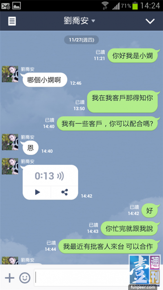 據《壹週刊》報導,該刊記者當時喬裝成援交經紀人和劉喬安交涉,今天還貼出多則LINE對話截圖,截圖中可以看到,劉喬安主動詢問: