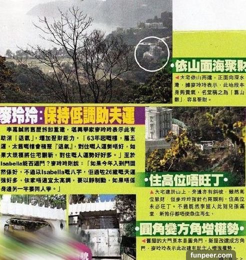 15/20李嘉誠華宅結穴,是在前頭金頭的山腰。據說,此山腰原本無平展開闊之地,但經過後來的開鑿,漸趨平緩,地基堆起向前,其形如同山唇,使龍氣兜聚不散。經云:「宅前無餘地子孫稀。」所謂「餘地」,即指屋前空地,即李宅之唇形地基。