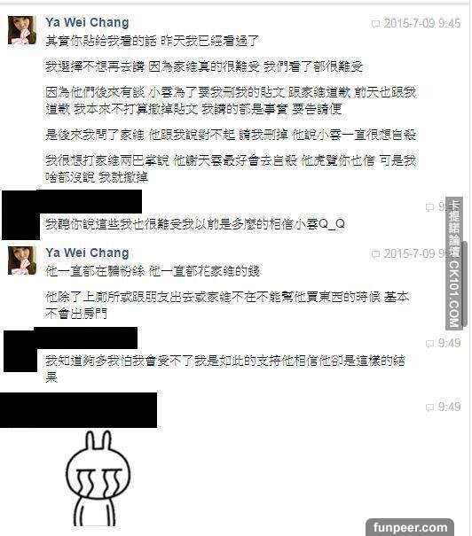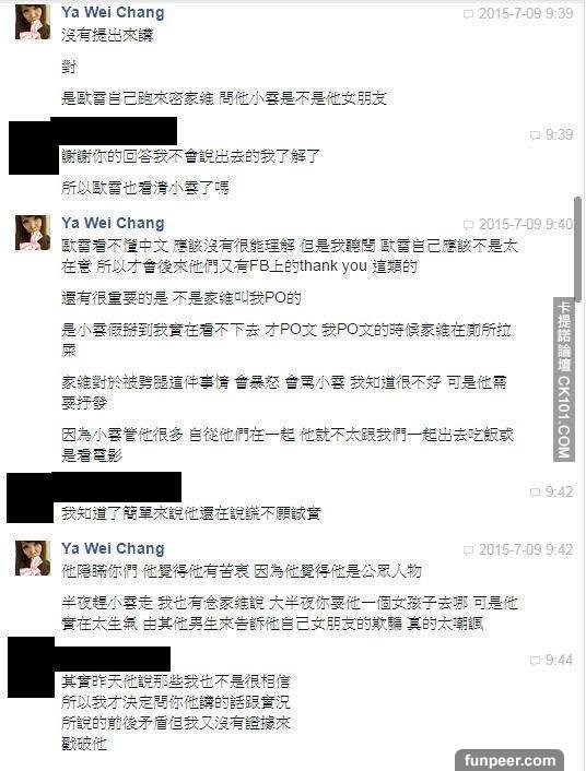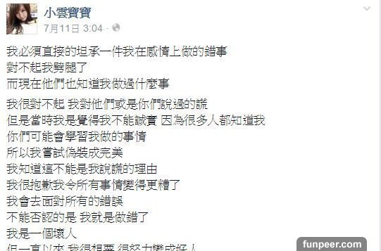 日前因傳出Olleh與小雲在一起的消息,讓網路盛傳小雲在還沒和awei分手的情況下劈腿Olleh,小雲則在11日也在臉書道歉承認自己劈腿。(試問小雲,劈腿不是會下地獄嗎?你為何還要這麼做....)