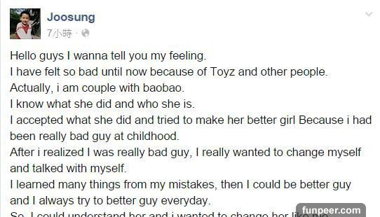 Olleh在臉書發文5小時後,Toyz也在臉書留言道歉說,「這次是我,是我玩出火了,玩笑開大了。」「眼睜睜看著上一任輔助離去,也就自然起來緊張導致自己也嘗試去干預一些自己不該干預的事情,而我的方式也是錯得很離譜,不管誰對誰錯我都應該看看就好,影響到別人我實在是罪該萬死。」表示自己會好好的去解決兩人之間的問題,最後也說,「最後大家請不要學我這麼白目,畢竟只有當事人最清楚他們自己的事情,他們的事情就讓他們好好解決吧!」