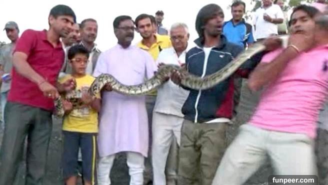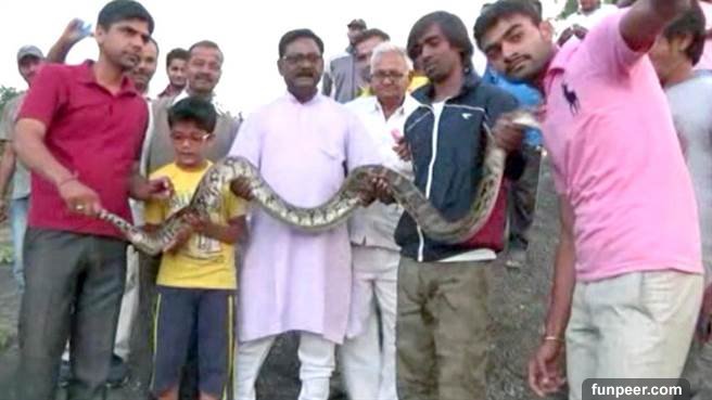 去年曾有統計數據指出,「自拍的致死率」竟比被鯊魚攻擊致死來得高!印度一群村民日前合力抓住校園的一隻大蟒蛇,為了避免發生危險,這群男子將蟒蛇帶到郊外野放。