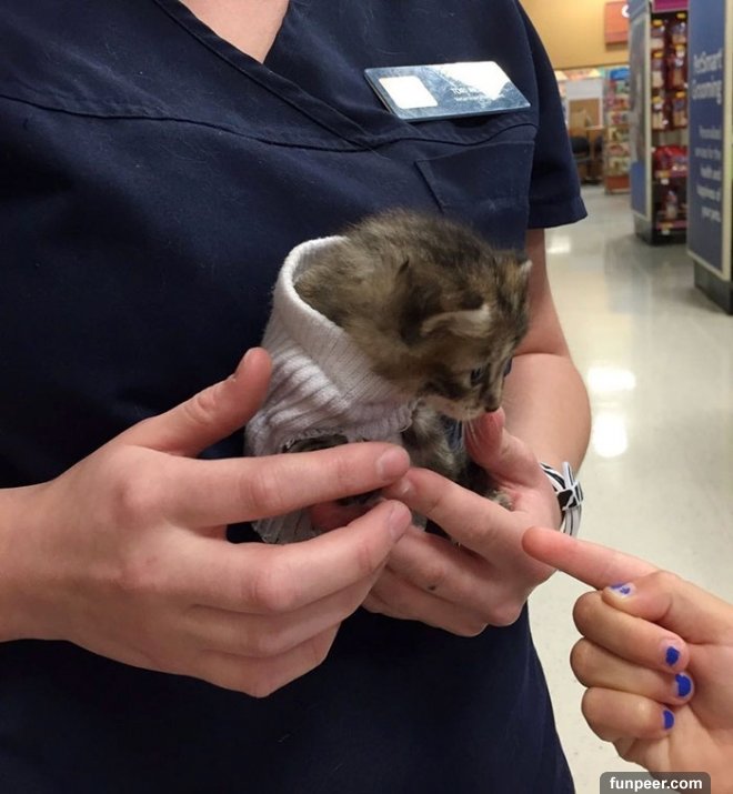 而獸醫助理Sarah也提到貓咪還非常的小,牠需要一個家而有一天,一家人來到這家Peetsmart購物,爸爸跟小孩們便注意到了這隻穿著高領毛衣的小貓咪