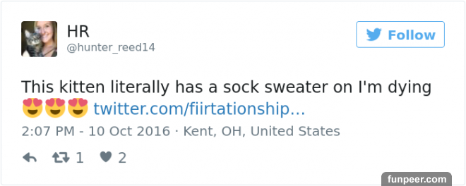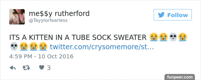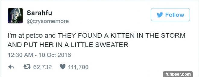 獸醫助理Sarah在她的twitter上發布了一則動態寫道「我現在在動物救難中心,搜救隊員在颶風當中救了一隻小貓咪,而且她們還幫她穿上迷你毛衣」