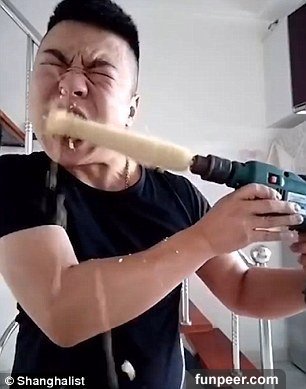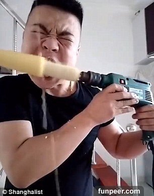 「電鑽」!「電鑽」!「電鑽」!他把玉米插上電鑽後~運用超高的轉速,用牙齒硬生生把與米粒就這樣刮下來!