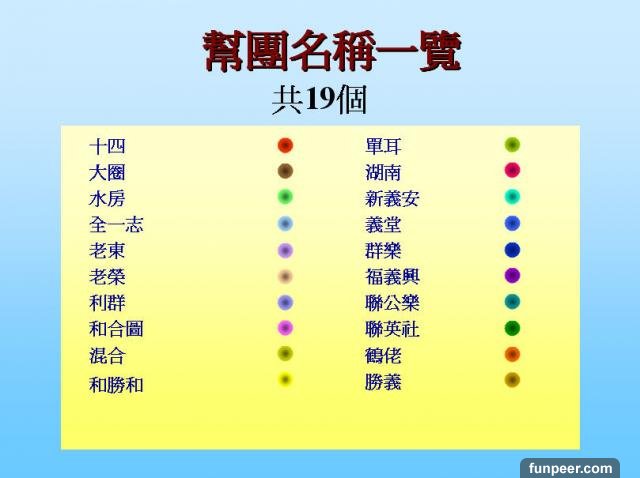 「突發」香港黑社會幫派勢力地區分布圖! 揭露十八區 各支派地盤!另附上:香港黑社會內幕 sponsored我們經常在香港的電影中看到黑社會,而且品目繁多,有板有眼,象古惑仔係列就蠻有那回事的,很有趣。我也很喜歡此類電影,那種血腥的殘忍與寂寞的冷酷總讓人產生一種異樣的浪漫情懷。那麼,究竟黑社會的真實面目是甚麼樣呢?我便將我所知的香港黑社會東東紹介給大家。(圖一:對應各幫會在香港地圖上所顯示的顏色點)
