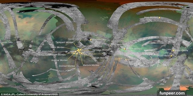 在土衛六的米斯林蒙特斯山上,卡西尼號發現了它擁有一個土衛六最高的山峰,高度約為10948英尺(3337米),如果跟地球上的珠峰29030英尺(8848米)相比較它要矮上許多。然而負責觀測的研究人員還發現,土衛六上的大多數高山都接近於它的赤道,而其他一些山峰的平均高度都到達了近萬英尺(3000米)高。從一些山體的形狀來看,土衛六上存在的一些河流一直在不斷地侵蝕著這些山體,因此上面的岩石形狀也是非常多樣的。