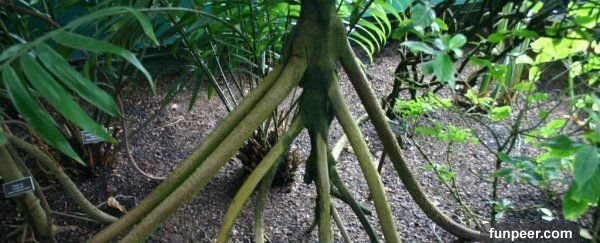 跟其它那些樹根完全藏在地下的樹木不同,行走的棕櫚樹有著懸空根系,從樹乾的下端開始分叉。它們看起來就象是一把掃帚。隨著時間流逝和土壤的侵蝕,其中一些根就死掉了,新的根就長出來。