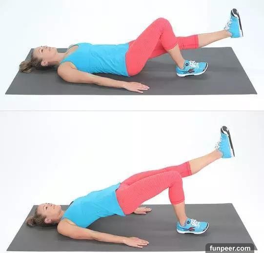 單腿臀橋:1、仰臥平躺,背部緊貼地面,雙手置於身體兩側,膝蓋彎曲,單腿著地,另一條腿保持懸空;2、臀部發力,向上挺起,至支撐腿的膝、臀、肩形成一條直線,保持2-3秒,感受臀部肌群發力;