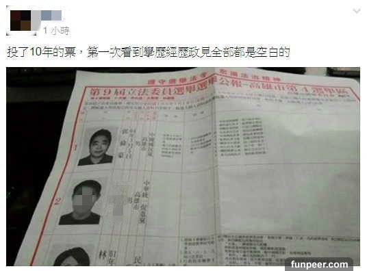 有網友在臉書社團「爆廢公社」貼出自己選區的選舉公報,並寫「投了10年的票,第一次看到學歷經歷政見全部都是空白的」,這張高雄市第4選區選舉公報上,竟有一位立委候選人的學、經歷與政見欄竟然完全空白,只寫上出生年月日與黨籍「中華統一促進黨」,讓人相當好奇為何會如此。