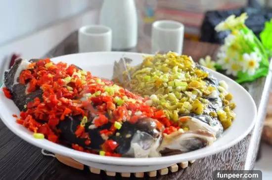 2.魚頭上鋪好兩種辣椒,腌漬魚頭的汁水不要,開水上鍋蒸8分鐘,燜3-5分鐘。3.鍋里放油,燒熱,到冒青煙,端下來涼三秒鐘,澆在魚頭上即可。