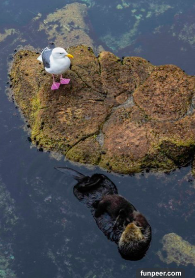 FACEBOOK/connieleephotoart 粉紅色蹼的鴨子和浮在水上的海獺形成了和諧的畫面。