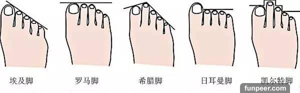 王凱羅馬腳:第一趾和第二趾基本等長。擁有羅馬腳的人較罕見,他們特別適合跳芭蕾舞。希臘腳:第二趾最長,各腳趾之間長短相差不大,過渡平滑。聽說美女都長希臘腳…日耳曼腳:又叫吉爾賽腳或粗人腳。至少有3個腳趾的長短相當,而且都比較短。如果你是日耳曼腳,那麼恭喜你···你真的很難買鞋~凱爾特腳:第二趾最長,各腳趾之間長短相差程度大於希臘腳。這樣的腳型腳型據說適合運動,黑人大多如此。100米世界紀錄保持者博爾特、著名長跑運動員佐拉·巴德等似乎都是凱爾特腳。