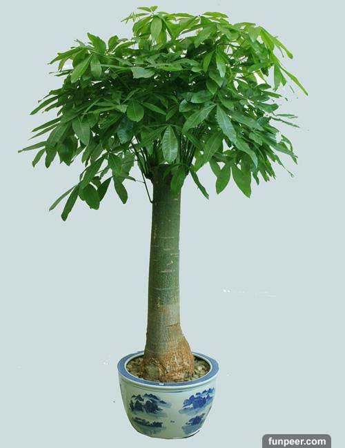 發財樹是常綠喬木,樹高8-15米,種於盆栽多不超過2米。掌狀複葉,小葉5-7枚,枝條多輪生。花大,長達22.5cm,花瓣條裂,花色有紅、白或淡黃色,色澤豔麗。室內觀賞多作樁景式盆栽。