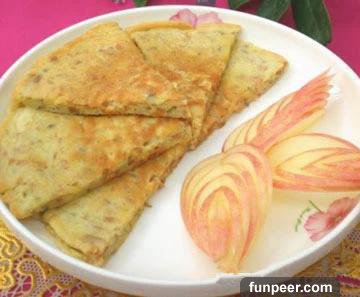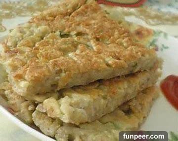 紅薯雞蛋煎餅:用料:紅心紅薯200克,雞蛋2個,麵粉50克,白糖適量,模具一個做法:1.先將紅薯洗淨後去皮,再切成粒,模具洗淨擦乾待用2.雞蛋打散成蛋液,加入麵粉與適量白糖,充分地攪拌成無顆粒狀的麵糊3.再將切好的紅薯粒放入麵糊中,攪拌均勻4.開小火,平底鍋內放油,放入模具,舀入適量的紅薯麵糊倒入模具內,用筷子將其表面弄平整5.等紅薯餅煎至成形後小心地取下模具,蓋上鍋蓋,小火將其煎至兩面金黃熟透即可.